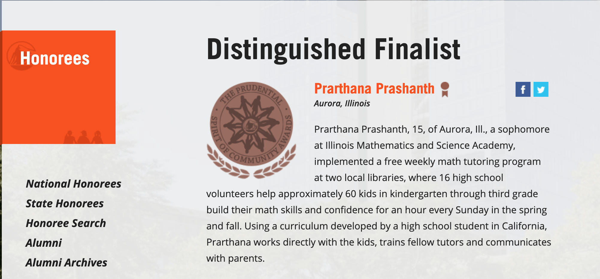 Prarthana was recognized for her service in bringing free weekly math program for students in kindergarten to third grade to her local community libraries, working with kids, training other high school tutors, and coordinating with parents and librarians. Congratulations Prarthana!
